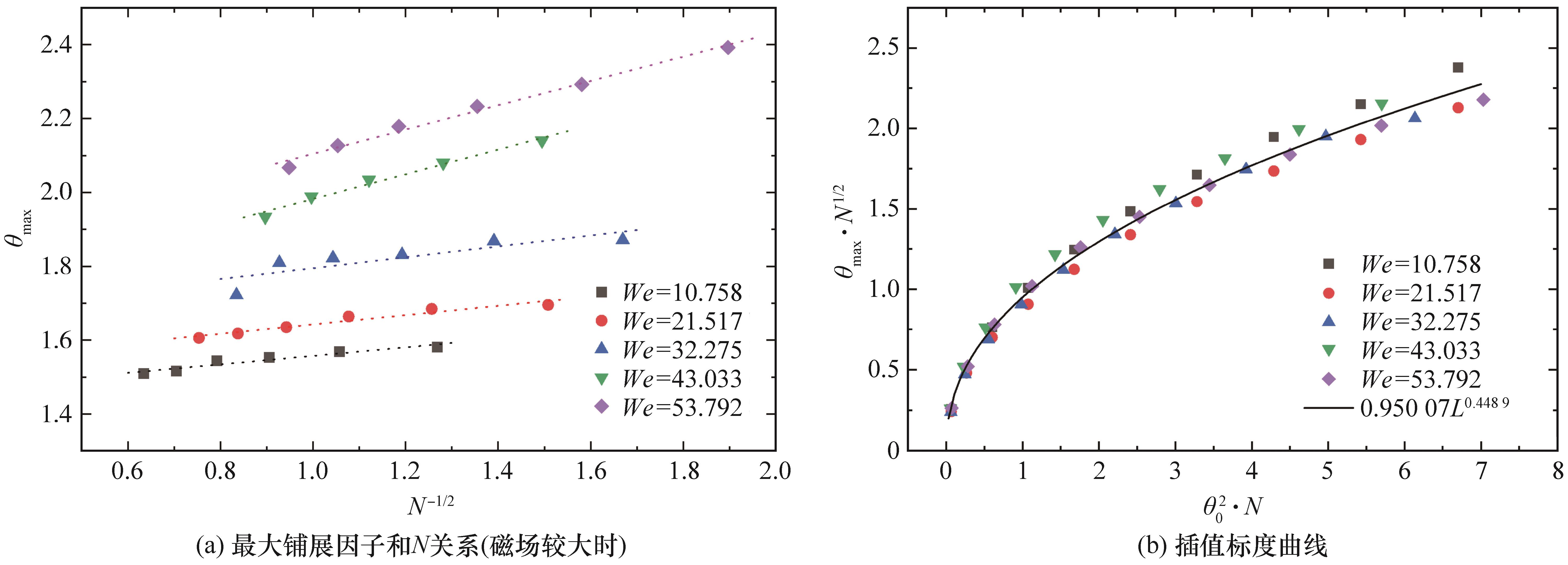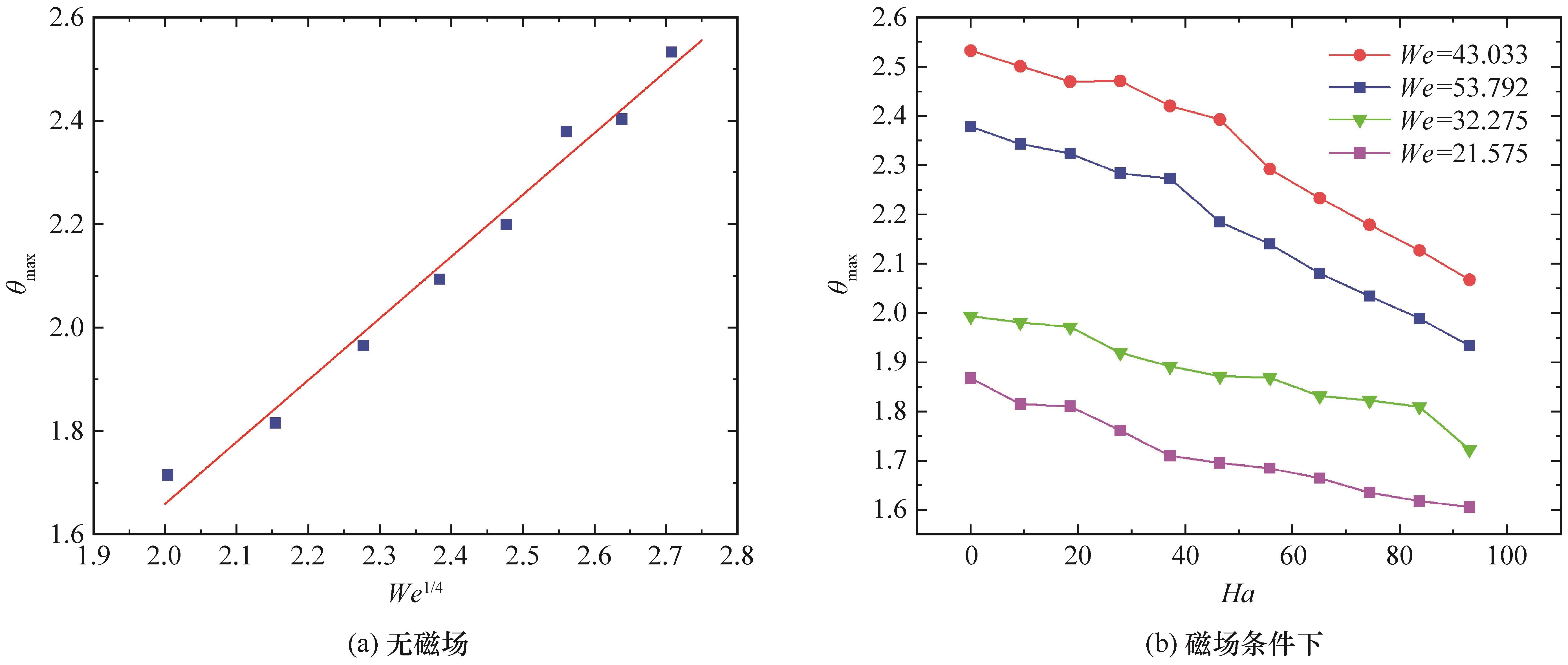 液态金属作为较为高效的热量运输介质在磁约束核聚变装置的设计中十分重要,如何预测强磁场下液态金属撞击凝固规律是其中的一个重要课题。通过高速相机拍摄竖直磁场作用下的镓铟锡液滴撞击金属固壁凝固的现象,本文总结不同底板过冷温度、不同撞击速度以及不同磁感应强度范围的金属液滴撞击铺展、回弹、凝固的特性。底板温度分别为20、-30、-40、-50 ℃,撞击金属底板速度为0.45~1.71 m/s,磁场强度范围为0~1.2 T。实验现象表明,液滴撞击等温壁面和过冷壁面时,最大铺展因子的无量纲标度率均遵循经典理论预测关系式。磁场对液滴回弹高度存在先促进后抑制的非单调影响,进一步推导了磁场作用下的最大铺展因子与N的经验关系式。磁场抑制液滴撞击过冷壁面的液滴分离,并通过减弱高度方向的震荡促进凝固。