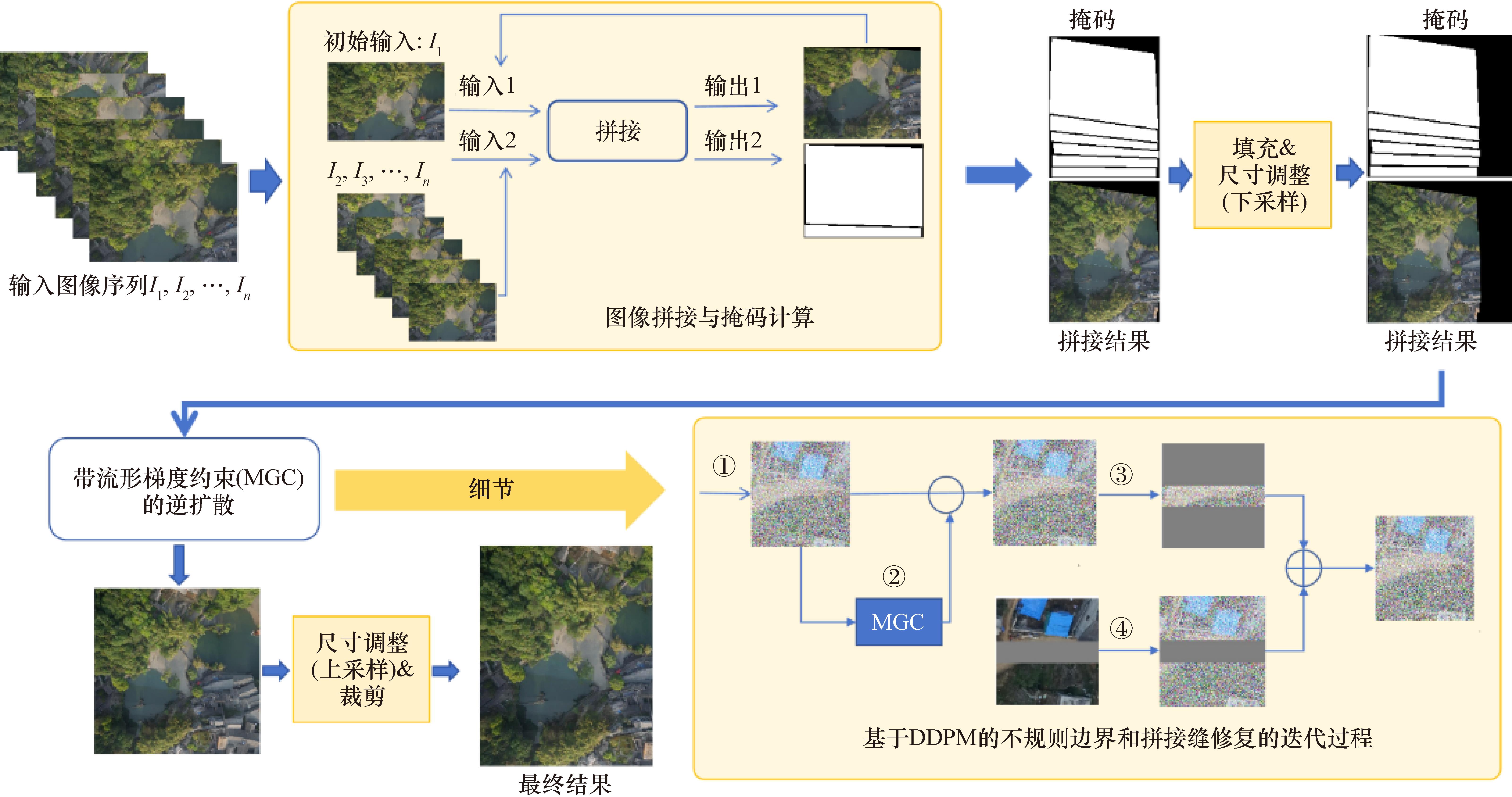 关键词: 无人机图像, 扩散模型, 图像拼接, 不规则边界, 拼接缝, 流形梯度约束