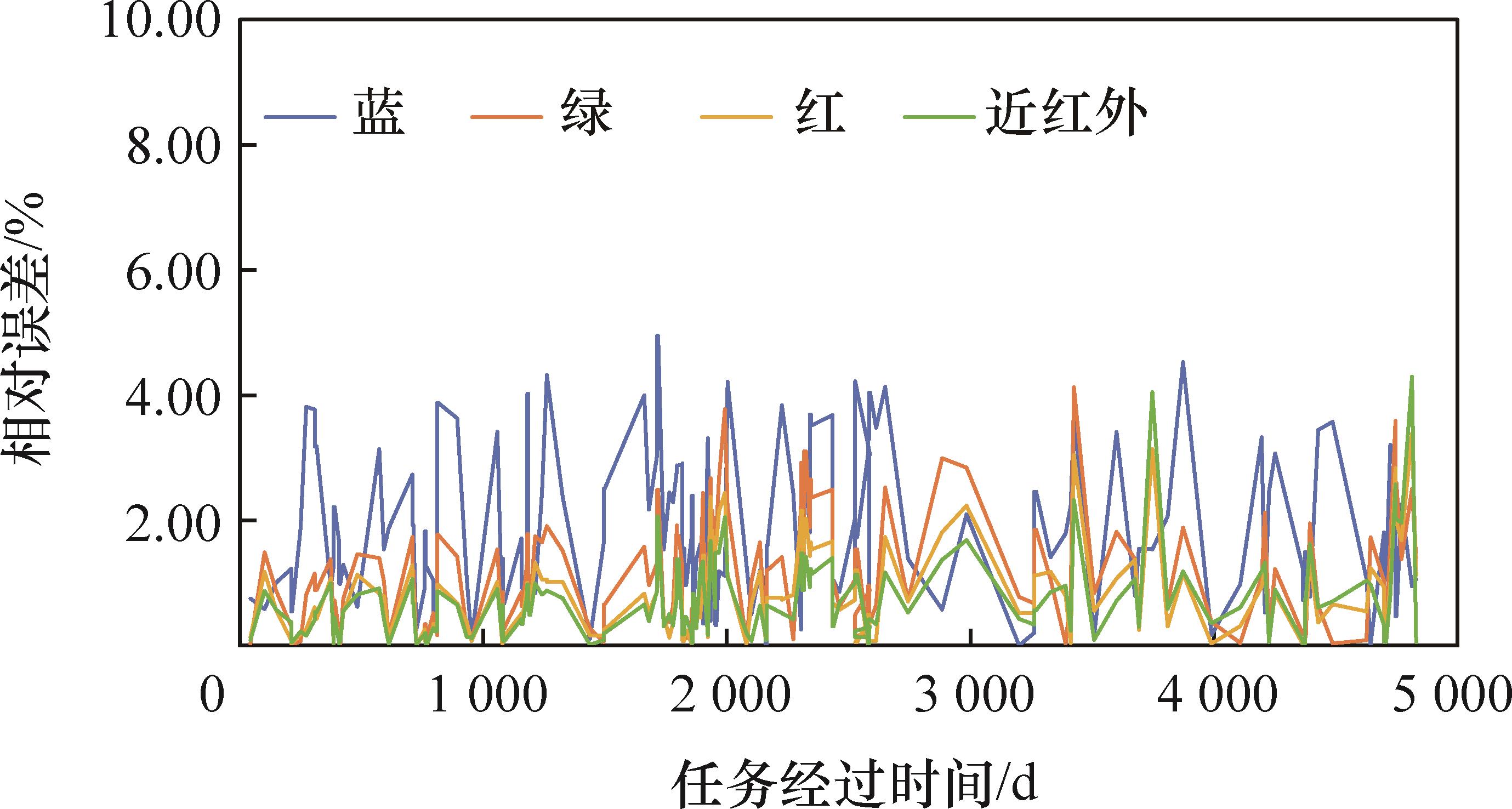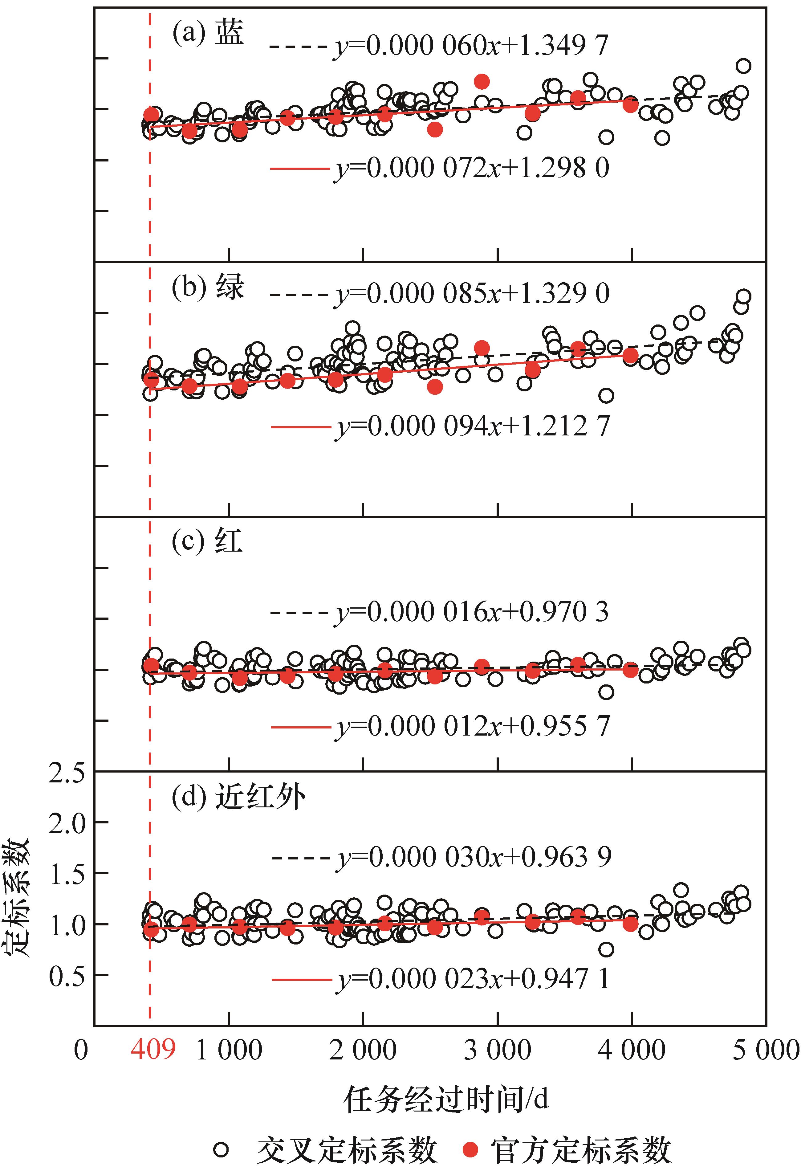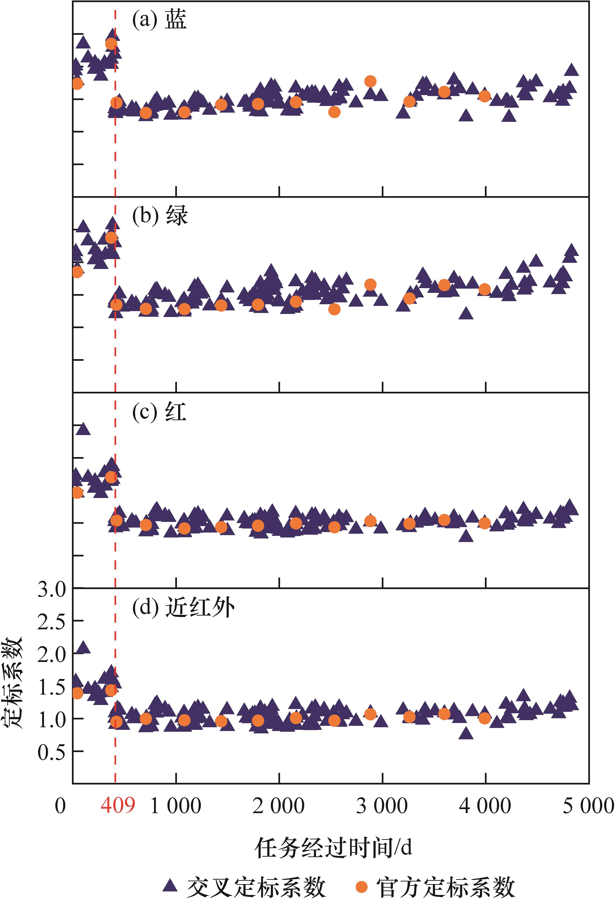 基于敦煌定标场,以Terra/MODIS为基准传感器,通过限制成像角度(小于20°)、成像时刻(小于2 h)、云量和成像质量等约束,筛选出2008年9月—2021年12月147组有效交叉定标影像对,利用6SV v2.1模型进行辐射传输计算得到二者之间的光谱匹配因子,最终实现对环境一号卫星A星(HJ-1A)CCD1传感器的长时间序列交叉定标。结果表明:1)计算得到的交叉定标系数与官方公布的场地定标系数高度一致,交叉定标系数与官方定标系数之间的平均相对差异小于2.25%,定标结果的不确定度在5.34%以内;2)长时间序列交叉定标结果表明,HJ-1A/CCD1传感器发射1 a后,其增益状态于2009年10月20日进行了调整,导致交叉定标系数在发射后的第409天发生突变,增益调整后整体辐射性能较为平稳;3)2009年10月—2021年12月期间,HJ-1A/CCD1传感器的辐射性能呈波动缓慢下降趋势,年衰减率小于3.10%。本文方法可以有效地提高HJ-1A/CCD1传感器的辐射定标频次和定标精度,实现对HJ-1A/CCD1传感器全生命周期辐射性能的监测。