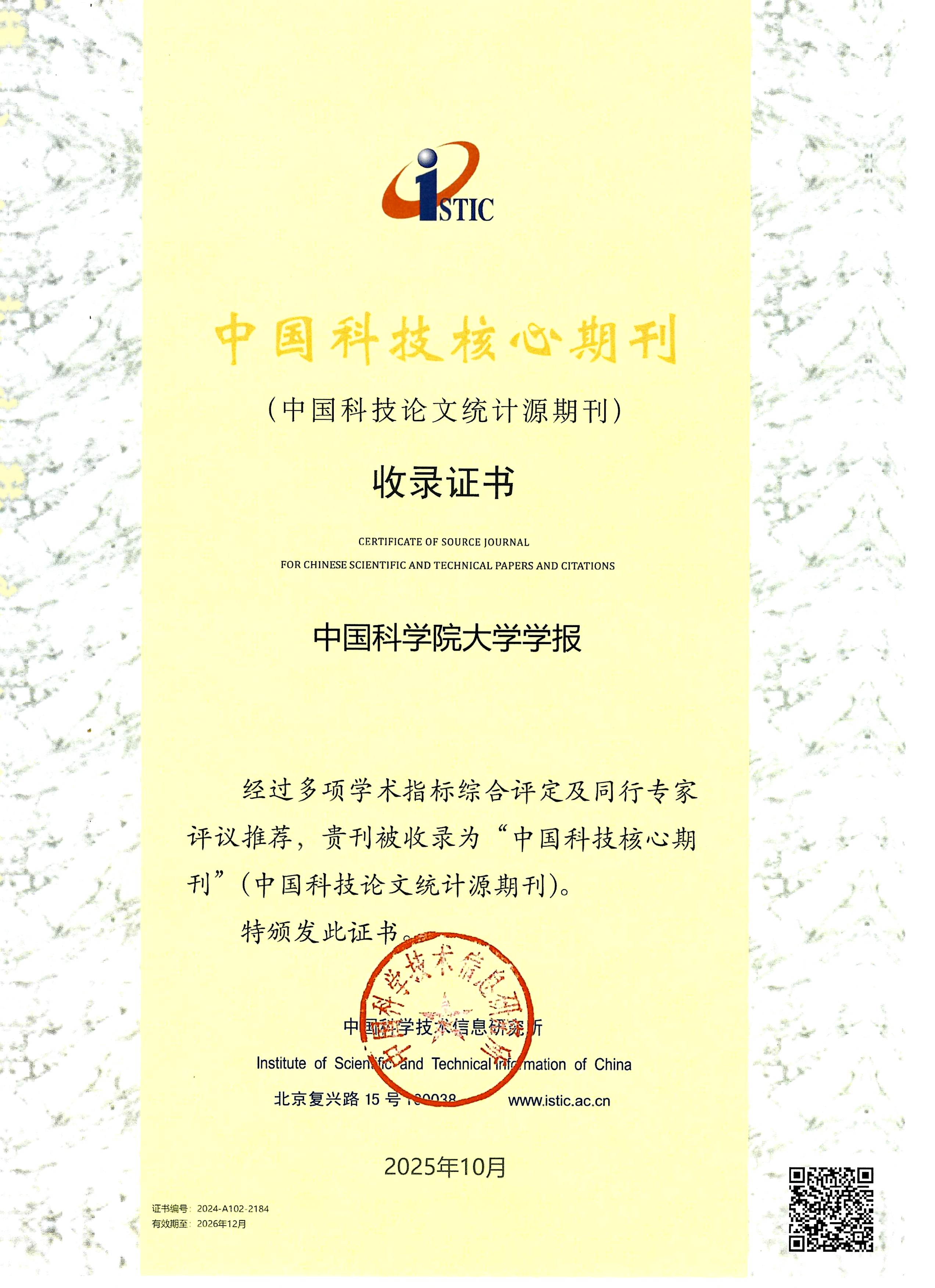 据中国科学技术信息研究所《中国科技期刊引证报告(核心版)》2025年版最新数据(2025年10月30日正式发布):《中国科学院大学学报》2024年度核心影响因子为0.706,在56份自然科学综合大学学报类核心期刊中排名第19位(该56份期刊影响因子均值为0.661),综合排名第13位。